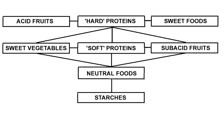 Between meat on the one end of the scale and fruits at the other, we may arrange our basic foods in the following order of their sensitizing effect on body and emotions: