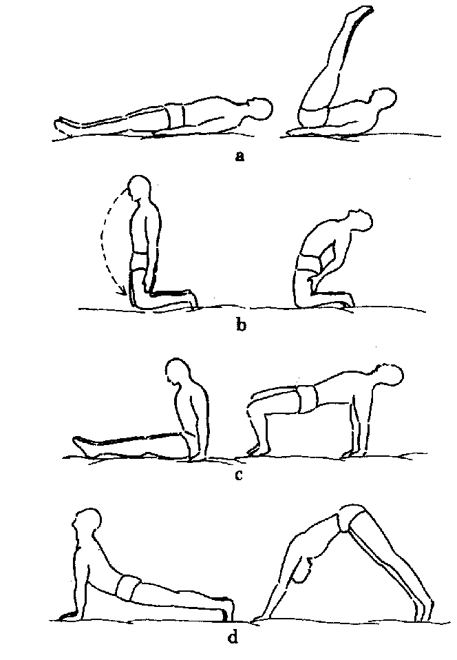 These are strengthening to the internal organs and invigorating. Slant-boards are commercially available. You may build one yourself by fastening a belt to one end of a body-length padded board. The feet are slipped underneath the belt to hold the body in position when the board is slanted, with the head about 30 cm lower than the feet. You may rest or meditate for a while on the board before and after doing some appropriate exercises, such as repeatedly lifting the torso to a sitting position, or tensing exercises. Do not use the slant-board if your blood pressure is very high.