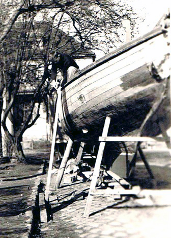 Fiberglass mats were already available at the time, but there were delivery difficulties with the polyester. It was therefore obtained in small quantities from an Aunt who lived in the west and so, jacked up in the open air, a plastic hull gradually emerged over the old oak hull, despite wind and weather.